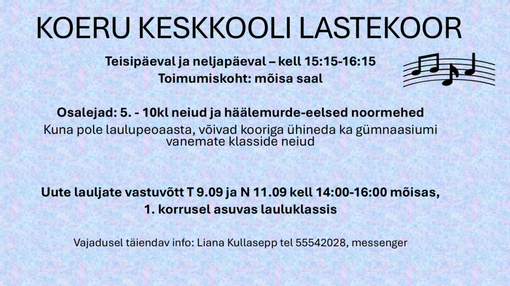 Marta-Luisa Fokejeva Sellel aastal on jällegi alustanud meie koolis gümnaasiumi teed üsna mitu uut õpilast. Uurisin nende käest mis on nende emotsioonid seoses Koeru Keskkooliga. Kust koolist tuled? Carmen Vinkel: Rakkest. Helen Kreek: Järva-Jaani Gümnaasiumist. Maria Poolakase: Kalmetu koolist. Sten-Marten Raal: Järva-Jaani Gümnaasiumist. Älis Paks: Mustamäe Riigigümnaasiumist ja Tallinna 32. Keskkoolist (1.-9. klass). Mis sulle […]