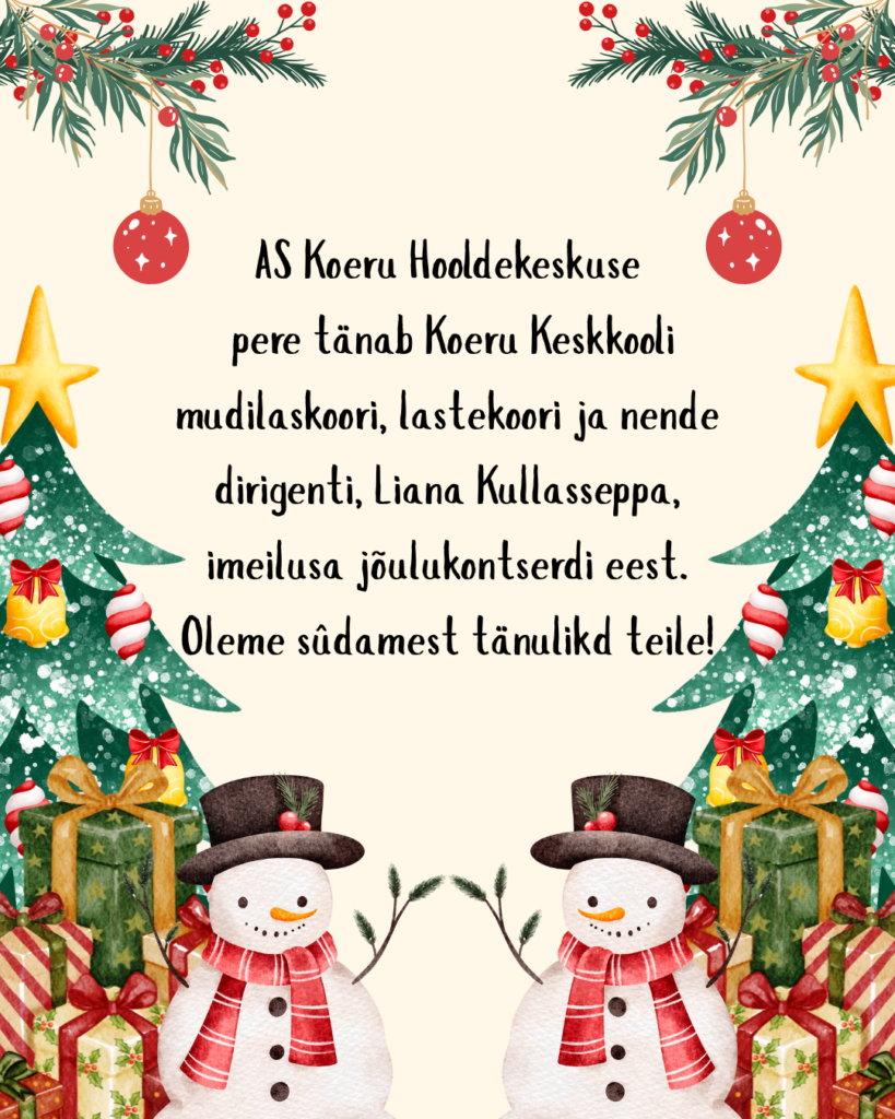 9. detsembril esitasid Koeru Keskkooli mudilaskoor ja lastekoor dirigent Liana Kullaseppa juhendamisel Koeru Hooldekeskuses südamliku jõulukontserdi.