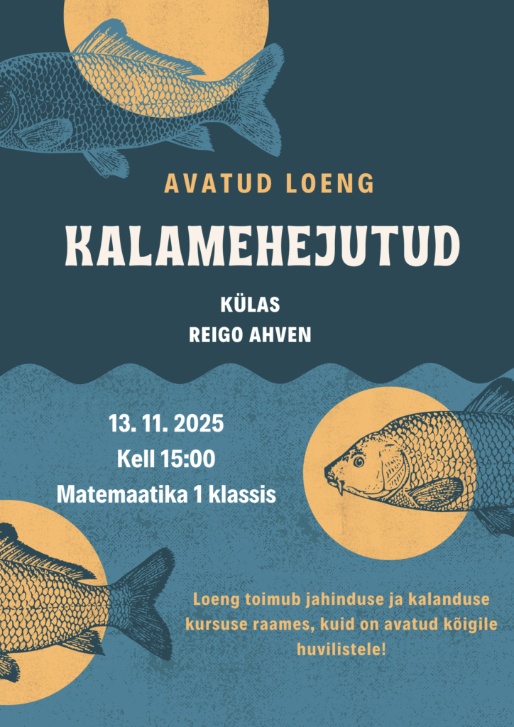 Kas kalamehejutud on tõesti liialdused või peitub neis siiski tõde? Tule ja saa teada!Kalandusest, kalapüügist ja looduselamustest tuleb rääkima Reigo Ahven. 📅 13. november 2025🕒 Kell 15:00📍 Matemaatika 1 klassis Loeng toimub jahinduse ja kalanduse kursuse raames, kuid on avatud kõigile huvilistele!Tule kuulama, kaasa mõtlema ja võib-olla jagama ka oma kalamehejuttu! 🐟