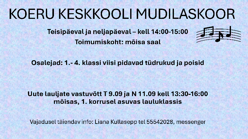 đ¶Â Koeru Keskkooli mudilaskoor alustab uut hooaega! đ¶ Koorijuht Liana Kullasepp ootab rÔÔmsaid poisse ja tĂŒdrukuid 1.â4. klassist mudilaskooriga liituma. âš Uute lauljate vastuvĂ”tt toimub: Tule ja leia endale laulurÔÔm ning sĂ”brad koorist! đ¶